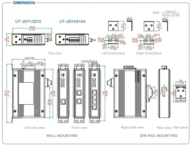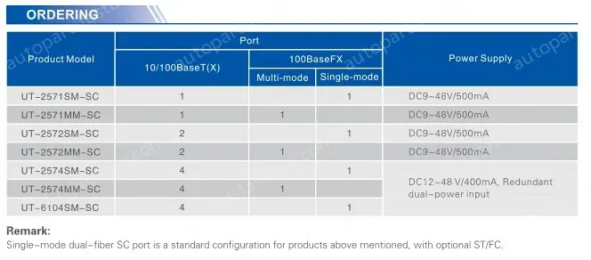 - 1x100Base-FX fiber port, 1x10/100Base-T(X) RJ-45 port
