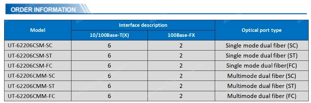 UT-62206C series are 8-port 100M unmanaged Ethernet switches, which have 6 10/100Base-T(X) Ethernet interface and 2 100Base-FX interface, plug-and-play; used for data communication between 100Base-TX twisted-pair cable and 100 Base-FX cable,it is suitable for the scenarios of intelligent community or FTTO. It automatically adapts to the transmission rate of 10Mbps and 100Mbps, which is convenient for users to upgrade. It extends the limit of network transmission distance from 100M of twisted-pair cable to more than 100KM, which can easily realize the interconnection between motherboard servers, repeaters, hubs, terminals and terminators.