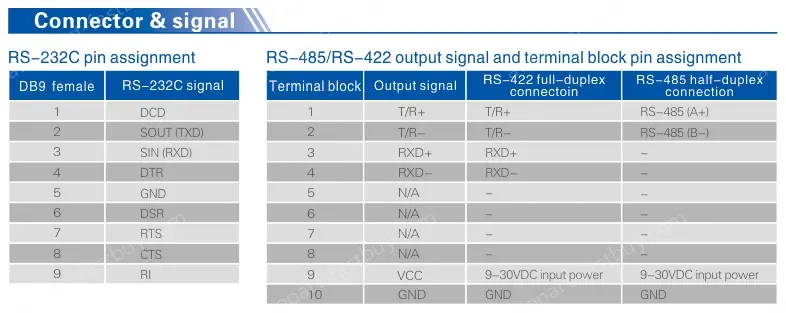 - RS-232 DB9 female connector input; RS-422/485 10 bits terminal block output