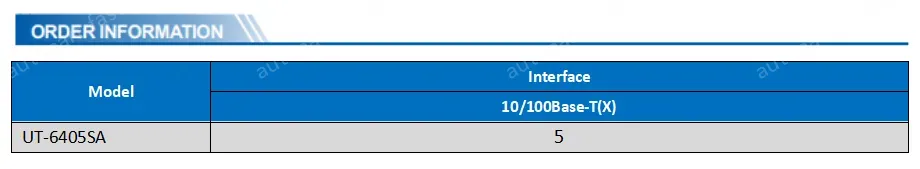 RJ45 interface: 5* 10/100/Base-TX, auto-detection, full/half duplex, auto MDI/MDI-X
