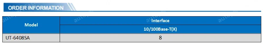 RJ45 interface: 8* 10/100/Base-TX, auto-detection, full/half duplex, auto MDI/MDI-X