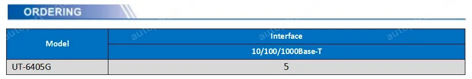 UT-6405G is a 5-port full Gigabit unmanaged Ethernet switch, providing 5 1000Base-T Ethernet port, which supports -40~85°C operating temperature and good EMC performance, and also supports industrial standard DIN-rail mounting and wall mounting to ensure normal operation in harsh environment, it is easy to install and apply on any industrial network.